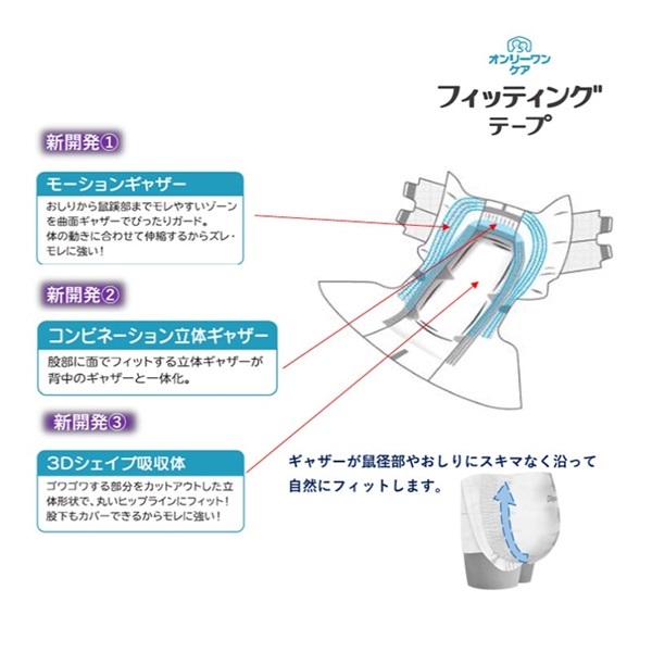 吸収目安:4回姿勢やからだの動きに合わせて伸縮する新開発の「モーションギャザー」と、立体的に立ち上がる「3D吸収体」で、 これまでにないパンツのような優しいフィット感を実現し、モレをしっかり防ぎます。